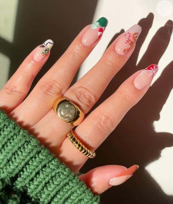 Agora, se você é daquelas que gosta de ousar, pode apostar nas unhas temáticas. Dá pra desenhar rena, Papai Noel, presentinhos, flocos de neve… Já vi até unha com luzinhas de Natal desenhadas e achei um charme.
